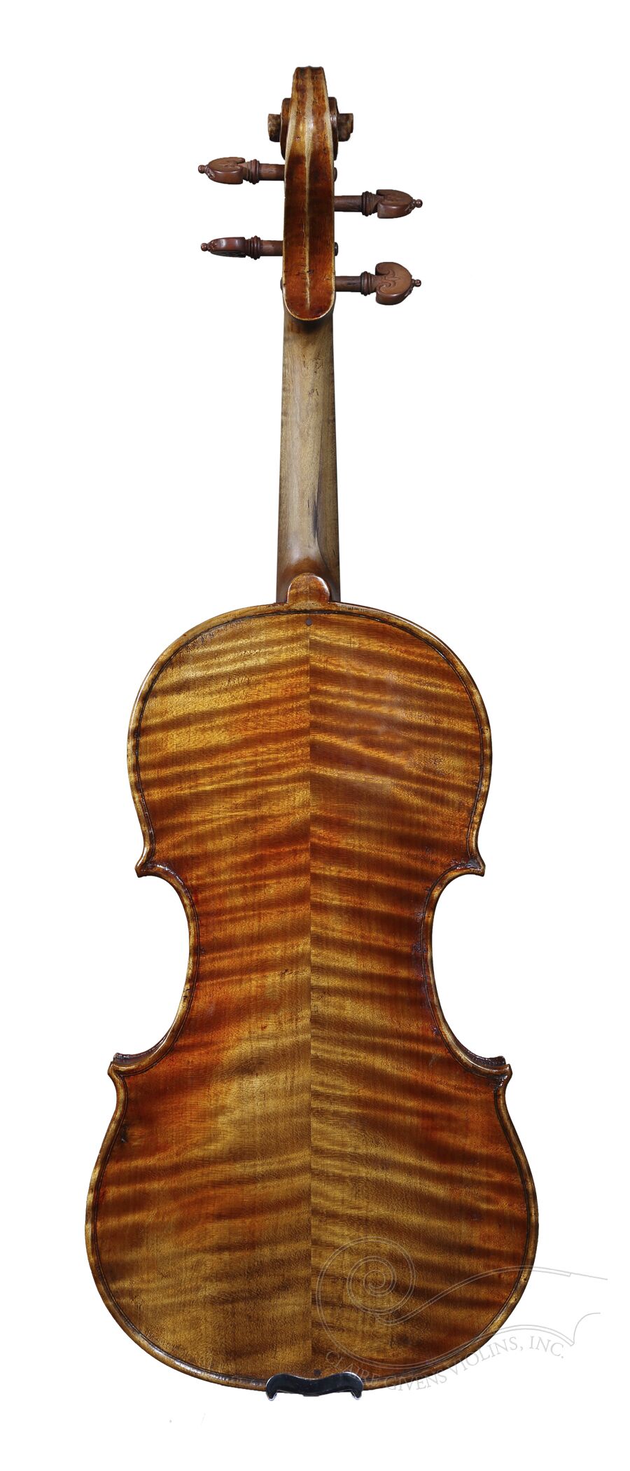 Douglas Cox received his early training as a violin-maker in Mittenwald, Germany in the late 1960’s and has since gone on to carve out a tremendous career as a master maker. Having received numerous awards from VSA competitions, Douglas Cox instruments are catching the eyes and ears of top players worldwide. This violin is exceptional: It has a stunning red-orange over amber varnish with a neatly flamed back. It also has a beautifully carved tailpiece with a similar carving on the pegs. This instrument produces a bold sound with endless color, and responds immediately. This instrument would be perfect for the professional looking for a solid companion.