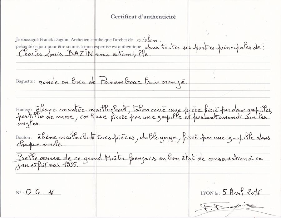 Charles Louis Bazin (Louis Bazin, b. 1881, d. 1953) was the son, pupil, and successor of C. N. Bazin II. Louis Bazin was the exceptional child taking up bow making at the tender age of 12 apprenticing with his father. He took over the family workshop in 1907 and continued in that role until 1952. He is considered the foremost member of the Bazin family, having achieved the highest standard and renown in the craft. 20th century violin virtuosi revered his bows and indeed, William Henley is quoted: “No better bows made by any contemporary maker.” The Bazin bow is accompanied by a Franck Daguin certificate of authenticity. The stick is nimble and acrobatic with clean articulation and attack. If you are ready for an athletic and exhilarating playing experience, the Louis Bazin bow is here for you.