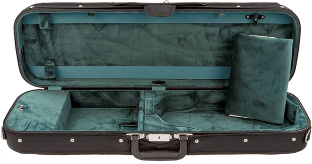 This oblong violin case offers durability and protection for your instrument. Built using a five layered plywood case construction, it is covered with a durable black nylon canvas zippered cover and an exterior pocket for accessories and sheet music. It has space to store a shoulder rest under the scroll as well as a storage compartment for other accessories and its wooden shell acts as a humidity buffer, which is great for drier climates. The interior is a Velour material with possible color options of Blue, Wine, Green, Gray, or Tan. Please inquire as to currently available colors.
