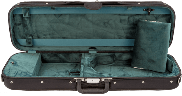 This oblong violin case offers durability and protection for your instrument. Built using a five layered plywood case construction, it is covered with a durable black nylon canvas zippered cover and an exterior pocket for accessories and sheet music. It weighs 4.5lbs and has space to store a shoulder rest under the scroll as well as sizable interior storage for other accessories. Its wooden shell acts as a humidity buffer, which is great for drier climates. The interior is a Velour material with possible color options of Blue, Wine, Green, Gray, or Tan. Please inquire as to currently available colors.