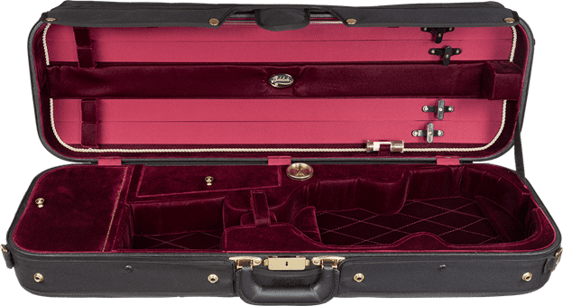This violin case is considered a standard professional case and offers durability and protection for your instrument. Built using a five layered plywood case construction, it is covered with a durable black nylon canvas zippered cover and has an exterior music pocket. It weighs 8lbs, has 2 storage compartments for your shoulder rest and other accessories, and offers a semi-French interior style for a snug fit for your instrument. It has been redesigned on a slant to increase shock protection and bow holder mechanisms are staggered to offer extra convenience. Its wooden shell acts as a humidity buffer, which is great for drier climates. The interior is a Velvet material with possible color options of Blue, Wine, Green, or Gray. Please inquire as to currently available colors.