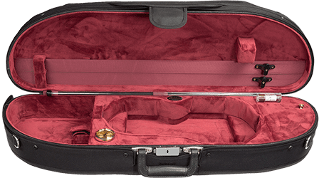 This half-moon violin case offers durability and protection for your instrument. Built using a five layered plywood case construction, it is covered with a durable black nylon canvas zippered cover and has an exterior music pocket. It weighs only 6.5lbs, has a slim design, and storage space inside for your shoulder rest and other accessories. Its wooden shell acts as a humidity buffer, which is great for drier climates. The interior is a Velour material with possible color options of Blue, Wine, Green, Gray, or Tan. Please inquire as to currently available colors.